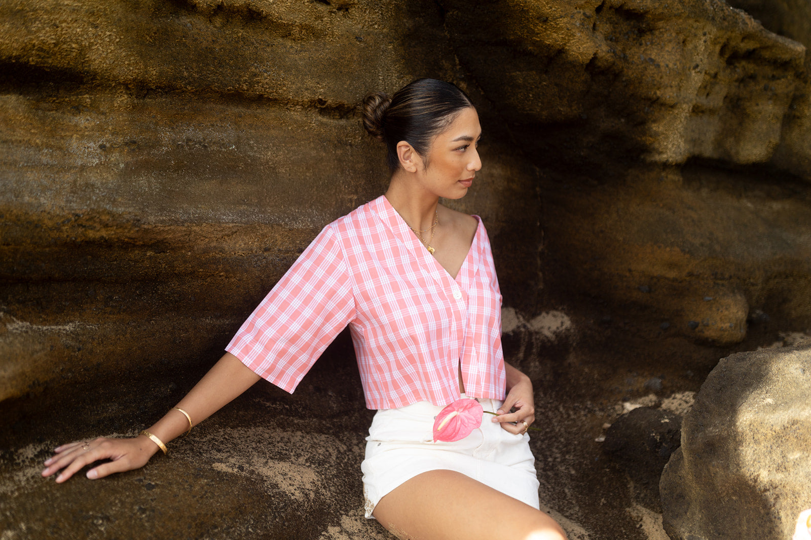 A half-sleeve cropped, one button blouse. For a little fun and a whole lot of fashion.